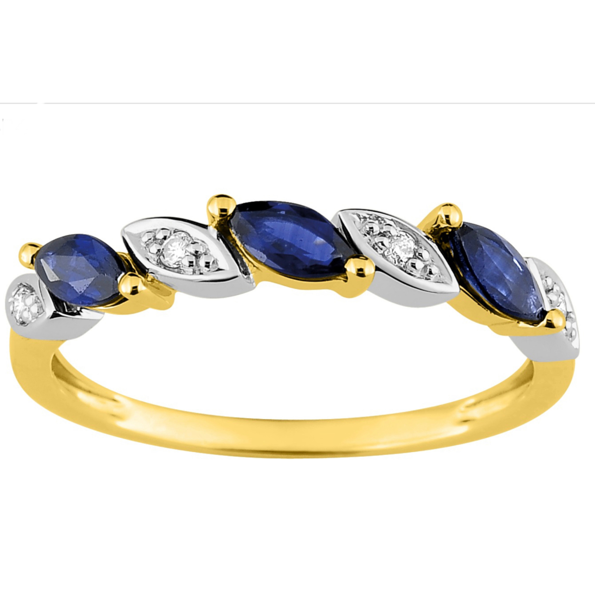 - |Description|Elégante bague Saphir et Diamants en Or 750/1000. Son alternance de saphirs et de diamants montés en épis ainsi que le mariage des 2 ors jaune et blanc en font une bague originale!