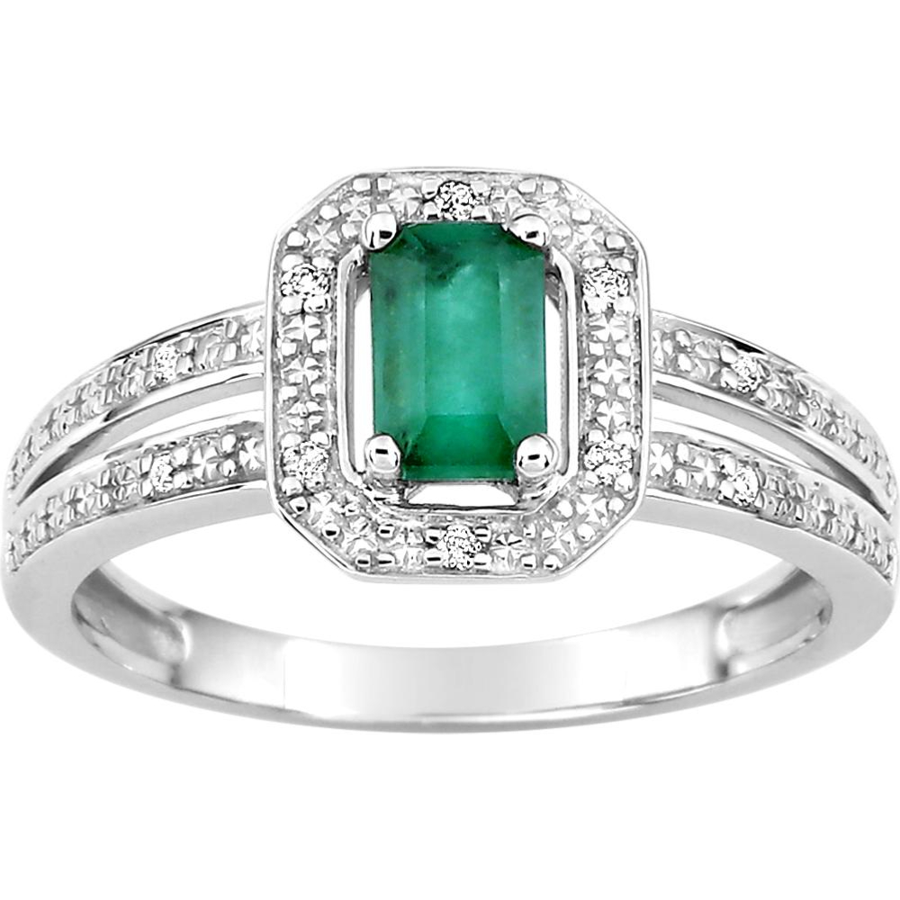 - |Description|Très belle bague en Or blanc 750/1000°. Elle est habillée d'une Emeraude taille emeraude, sertie par 4 griffes, ceinte de diamants et d'un effet diamanté,